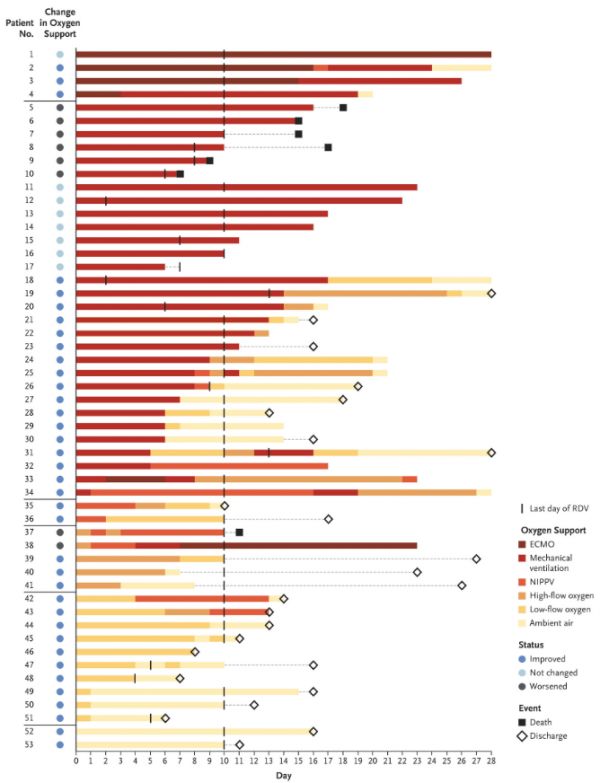 吉利德在《新英格兰医学》杂志上发布了瑞德西韦(Remdesivir)治疗新冠肺炎(COVID-19)的首个临床研究结果。结果显示,在53名来自美国、欧洲、加拿大及日本的严重和危重新冠肺炎患者中,瑞德西韦给68%(36人)的患者带来临床改善。其中,57%(30/53)接受机械通气的患者中有17例已拔管。共有47%(25/53)的患者出院,13%(7/53)患者死亡;在接受有创通气的患者中,死亡率为18%(6/34),而未接受有创通气的患者为5%(1/19)。