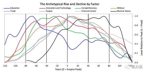 Ray Dalio最新文章The Big Picture in a Tiny Nutshell中的一个总结很有趣:在一个帝国/国家逐渐走向兴盛的过程中,教育水平是重要前提(下图中的深蓝色线条),但逐渐被科技、军事力量、贸易、金融等其他因素超越。到了鼎盛时期,教育的相对重要性会大幅下滑。
