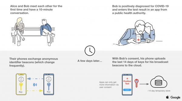 相比之下,Google 的公告更“亲民”一些,用图画的方式展现了与苹果合作的技术原理。