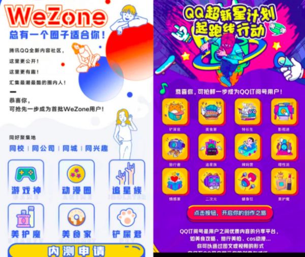 根据其内测界面介绍可知,这是一款内嵌于QQ内的全新内容社区,可以结识志趣相投的人。值得注意的是,QQ还在同期启动了名为“QQ超新星计划”的活动,这是一个基于QQ订阅号的计划,QQ开放了大批QQ订阅号名额,鼓励用户创造分享优质内容。两款产品都在鼓励用户生产优质内容,QQ也寄希望于通过优质的内容创作吸引用户。