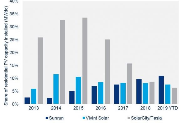 美国光伏前三强Tesla solar roof、Sunrun、Vivint Solar市占率走势 图源Electrek