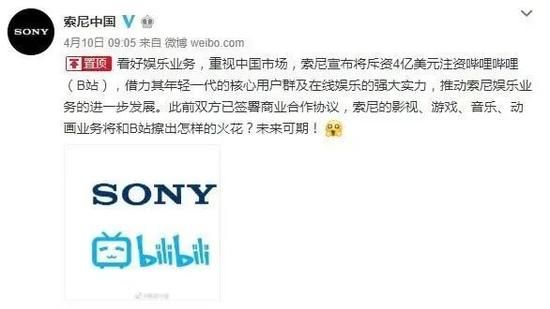 4月10日,索尼中国官微表示,看好娱乐业务,重视中国市场,将借力B站年轻一代的核心用户群及在线娱乐的强大实力,推动索尼娱乐业务的进一步发展。