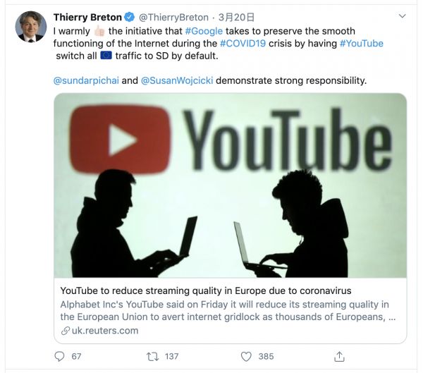 Thierry Breton发推,点名表扬Google带头将YouTube视频默认清晰度切换为标清