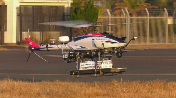 测试开始于中通岛的上京机场,他们将新鲜捕获的 20 公斤的长牙石斑鱼等装进一个保温箱,然后吊在一架雅马哈 Fazer R G2 无人驾驶直升机下面。