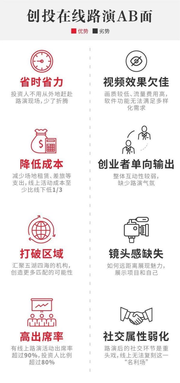 北塔资本投资总监刘晓亮则表示,路演上线后也省去了参与各方的通勤成本,“尤其是对于投资人,他们不用再特意坐高铁、飞机从外地赶来,少了折腾,他们的体验应该会比线下好很多”。