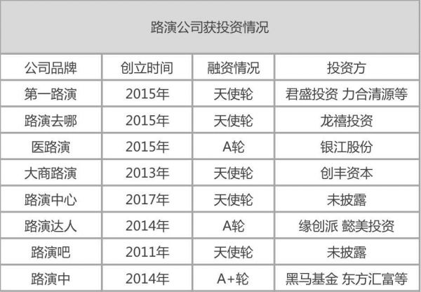 记者在相关企业平台上搜索发现,目前国内主营业务为路演服务的公司有百余家。其中,近十家路演公司在过去发展中曾获得资本的加持。多数公司组织的路演活动都有固定的频率,邀请相关领域的创业者与投资人参与,每月1~4次不等;除了常规路演活动的组织,部分公司还拓展了路演辅导培训、创投教育、财务顾问等相关服务。