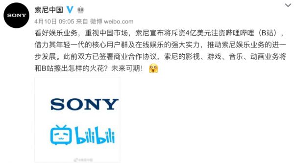 4月9日,B站和索尼公司同时宣布,B 站获得索尼 4 亿美元的战略投资。索尼将通过旗下全资子公司索尼美国(SCA)对 B 站新发行的 Z 类普通股进行认购。交易完成后,索尼将通过其子公司持有 B 站已发行股份总额的约 4.98%。