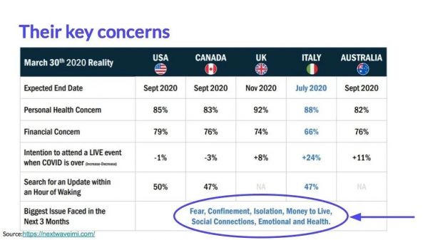 而纵观国际不同国家的人们,对于疫情之中和接下来3个月最关心的角度还有:恐惧、隔离限制、孤立无缘、维持生存的经济支持、社会连接、情感和健康。