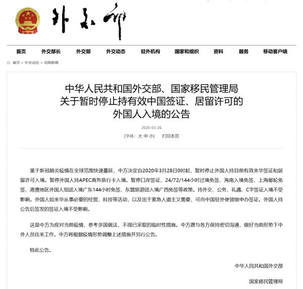3月26日,外交部和国家移民局联合发文,鉴于新冠肺炎疫情在全球范围快速蔓延,中国决定自3月28日0时起,暂时停止外国人持目前有效来华签证和居留许可入境。