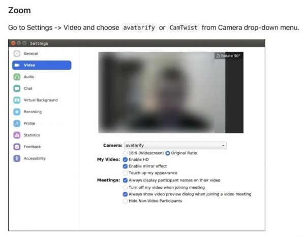 在 GitHub 上,作者给出了具体的安装方法,添加完成后在 Zoom 中选择设置摄像头使用 avatarify,就可以将生成的图像通过 OpenCV 实时推送到视频流了。