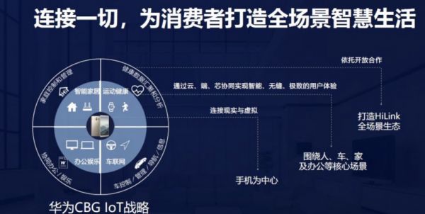 到 2018 年,华为已经形成了「1+8+X」对物联网战略。「1」是作为中心业务的手机,「8」指八大类设备,包括 4 个大屏幕智能设备:PAD、个人电脑、智能电视和车载智能屏幕(车机)。还有 4 个小点的设备:智能音箱、耳机、眼镜和手表。「X」指泛 loT,是华为与其他智能设备的连接,也正是华为 Hilink 在做的事。