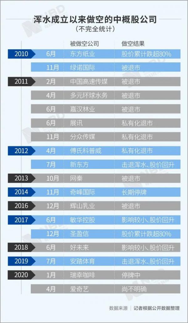 在浑水之外,另一知名做空机构香橼,在6年里先后狙击了20家中概股公司,其中15家股价跌幅超过66%,7家已经退市,这一数据还在不断更新。