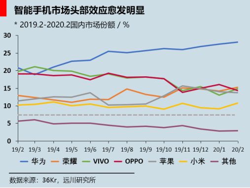 而伴随着手机同质化严重,强者愈强,弱者离场,基本成为定局。短短几年,国内手机市场就从倒三角格局逐渐转变为T字形格局,2019年,仅前五大厂商(华米OV+苹果)就已经吃下90%多份额。