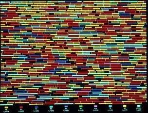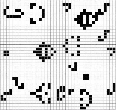 对每一个生命,我们根据它当前的颜色,以及它的邻居的颜色,运用上面的规则,确定它下一代的颜色。所有方格同时根据这些规则从一代到下一代变化。人们很快就发现,根据初始条件不同,结果也非常不同。有时,游戏变化很快,所有的生命全部死亡;有时,一些细胞群体像晶体一样固定下来,停留在一种固定的模式上不再发生变化;但大多数情况,在计算机屏幕上,你将看到各种沸腾着的结构。例如下面的几种瞬间的结构: