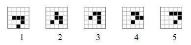 生命游戏中的一种有趣的结构被称为“滑翔机”(glider),在4个周期的一个循环中,这个小家伙会沿着对角线的方向在方格上爬行,转换自己的位置,如图: