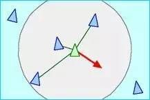 当 Boid 与某些邻居靠得太近的时候就会尽量避开。如图所示,中心的 Boid 会尽量逃避其它的 Boid 以避免碰撞。
