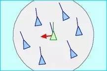 如果加入一条规则还能让 Boid 聪明地避开障碍物。当一只Boid发现前方有障碍物的时候,就改变自己的运动方向尽可能避开障碍物。我们可以把障碍物理解为一块有排斥力的磁铁,并且距离越近排斥力越强。那么 Boid 群体会很聪明地避开障碍物并且重新组织飞行的姿态和方式,下面是一群 Boid 在飞行中避开障碍物的实例。