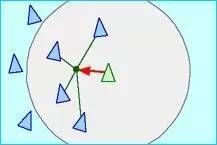 每个 Boid 都要去尽量靠近它的邻居所在的中心位置,如上图示,圆心处的 Boid 是当前的 Boid,它要尽量飞向其他邻居位置的平均中心位置(即图中箭头指向的点)。