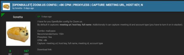 暗网中的一个讨论者建议使用OpenBullet的Zoom特定配置。OpenBullet是一个Web测试套件,可用于刮擦和解析数据,进行自动笔测试等。