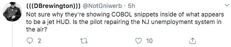 这位网友联想到了出故障的新泽西失业系统:“不知道为什么他们会在看起来像喷气HUD的里面显示COBOL片段。飞行员是否正在维修新泽西州的失业系统?”