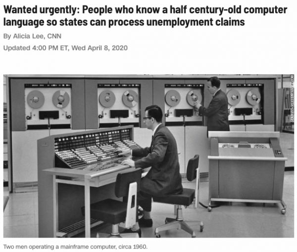说到这个梗的来源,还得从上周美国新泽西州急聘懂COBOL语言的程序员说起。由于新冠疫情,失业人数暴增,新泽西州几十万份失业救济申请压垮了用了好几十年的失业系统,急需懂COBOL语言的人来修。