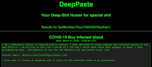 3月31日,一位自称是西班牙医生的人在暗网论坛上发帖, 宣布将出售24份新冠病毒感染者的血液与痰液样本: