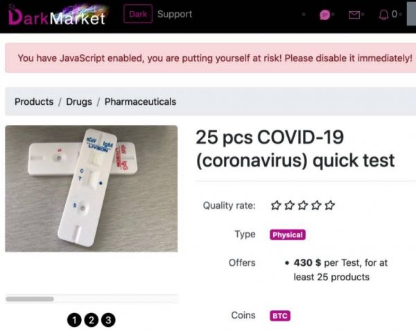 在暗网市场DarkMarket上,就有人在出售新冠肺炎检测试剂。25份检测试剂的总售价为430美元,等于一份17.2美元(120元人民币),支持比特币与门罗币支付。