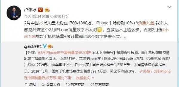 其中,小米集团卢伟冰表示,2月中国大盘大约在1700-1800万,iPhone市场份额占到10%以上,换言之就是iPhone在2月份在国内的出货量应该在170万以上。