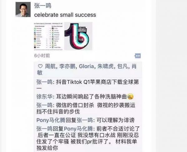 2018年5月,张一鸣曾在朋友圈留言称“微信的借口封杀、微视的抄袭搬运挡不住抖音的步伐”,这条留言很快就引来了马化腾,后者回复道“可以理解为诽谤”。