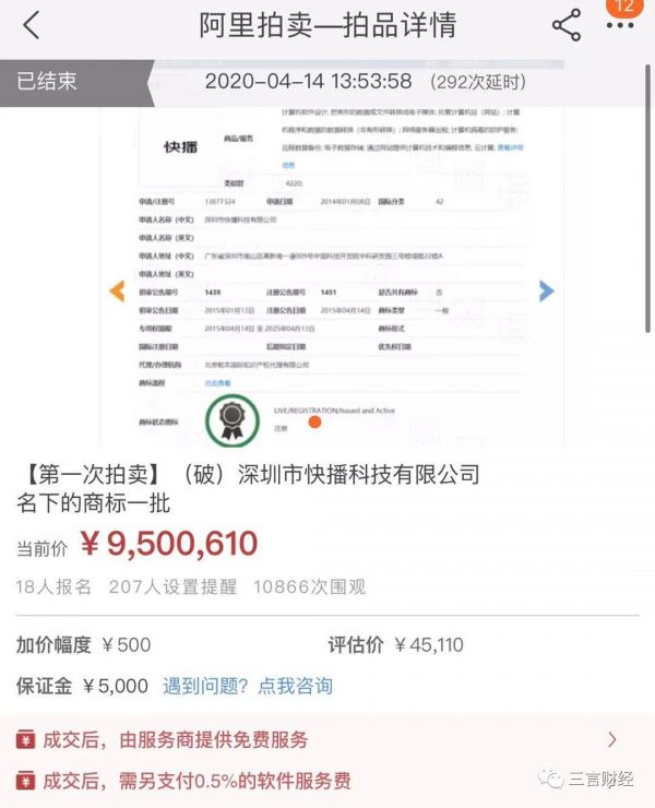 最终,专利经过两次竞买,以134990元的价格在14日上午10点拍卖成交;商标经过402次竞买,以9500610元的价格在下午13:53成交。