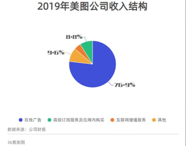 剥离智能硬件业务后,美图的营收结构显得更加单薄。在线广告成为最大的收入来源,在总收入中的占比达76.9%。其次是高级订阅服务及应用内购买、互联网增值服务和其他。