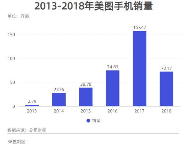 但高人气并不一定与高销量和高市场份额挂钩。从美图手机的销量来看,2016-2017年,美图手机销量实现同比翻番;而到了2018年,美图手机销量同比腰斩。