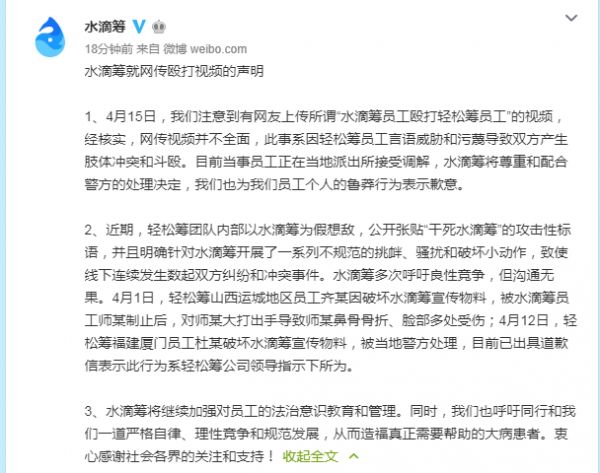 4月14日,网曝水滴筹员工暴打脚踹轻松筹员工,视频中有人大喊“水滴筹打人了”。对此,水滴筹官方微博4月15日发布声明表示:4月15日,我们注意到有网友上传所谓“水滴筹员工殴打轻松筹员工”的视频,经核实,网传视频并不全面,此事系因轻松筹员工言语威胁和污蔑导致双方产生肢体冲突和斗殴。目前当事员工正在当地派出所接受调解,水滴筹将尊重和配合警方的处理决定,我们也为我们员工个人的鲁莽行为表示歉意。
