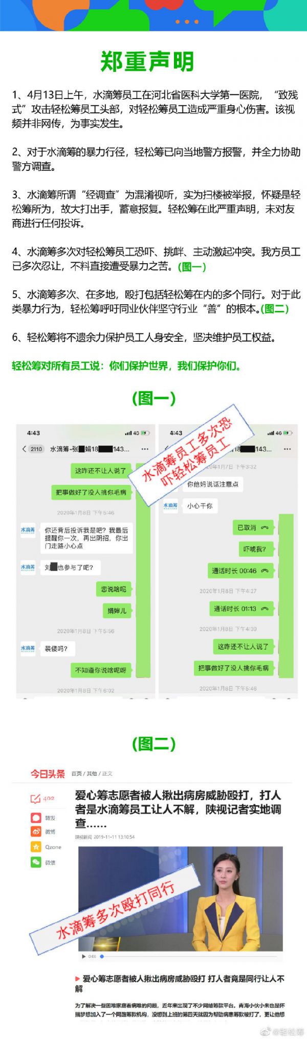 对于网传轻松筹员工被水滴筹员工殴打一事,轻松筹4月15日回应:”保护员工,绝不向恶势力低头!”