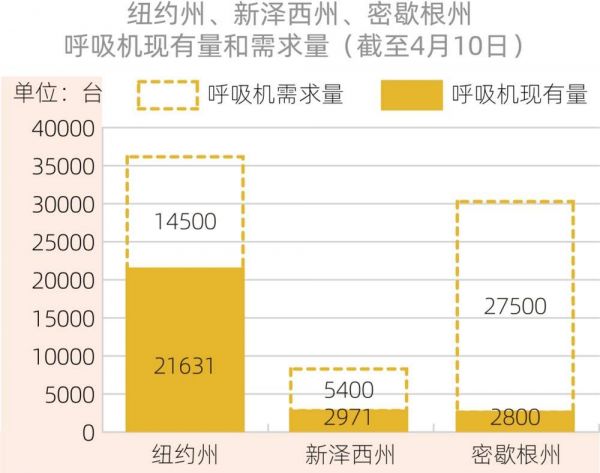 直到上周,美国各州现有的呼吸机仍供不应求,以下是美国因新冠肺炎死亡人数最多的三个州(纽约州、新泽西州和密歇根州)呼吸机现有量和需求量的条形图。