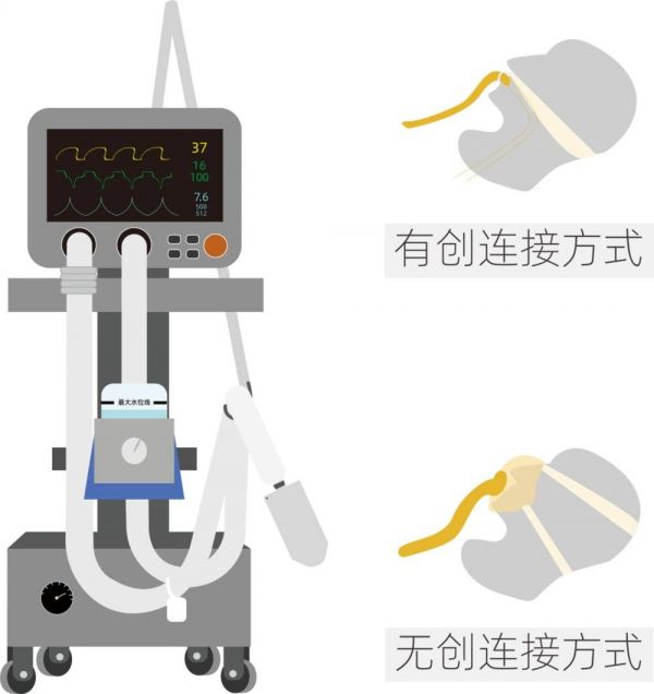 其中,无创呼吸机一般通过密闭式的面罩通气,而有创呼吸机则要把通气的管道插进气管了。