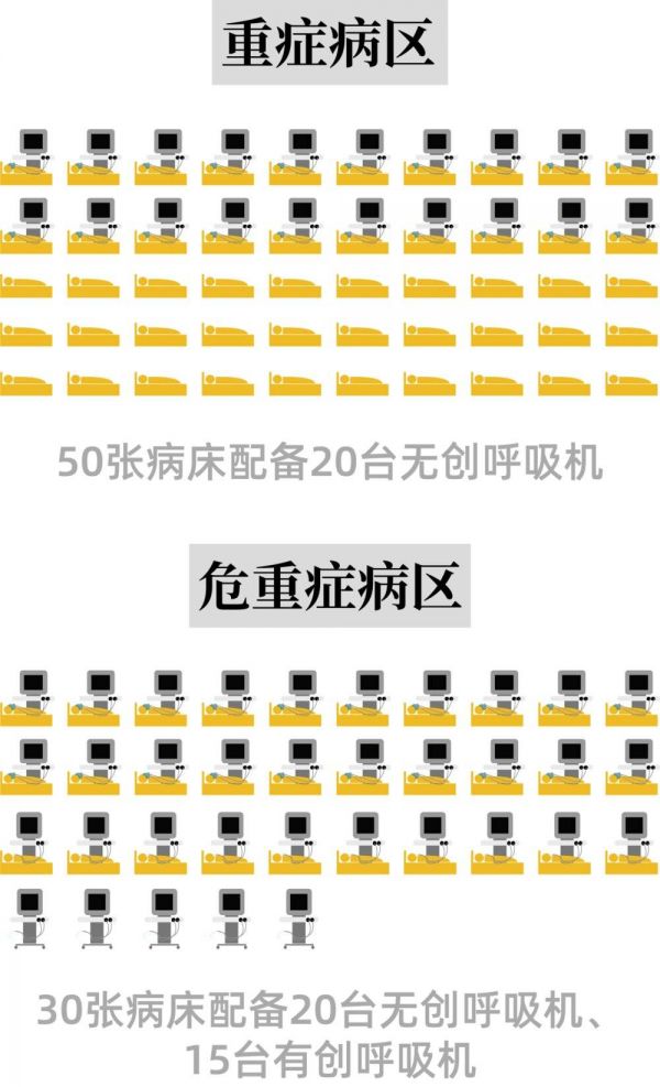 在中国,根据国家卫健委指导、武汉同济医院联合北京协和医院、中日友好医院等各家医院共同发布的《重症新型冠状病毒感染肺炎诊疗与管理共识》,重症与危重症病房应按这个比例配备呼吸机: