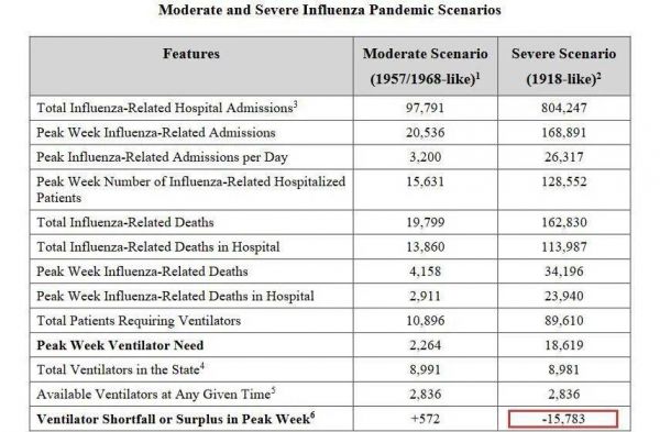 而在美国,呼吸机不足的问题早有警告。2015年,纽约州曾发布过一份长达272页的呼吸机分配指导文件[7],其中估算了流感疫情爆发时的呼吸机需求。