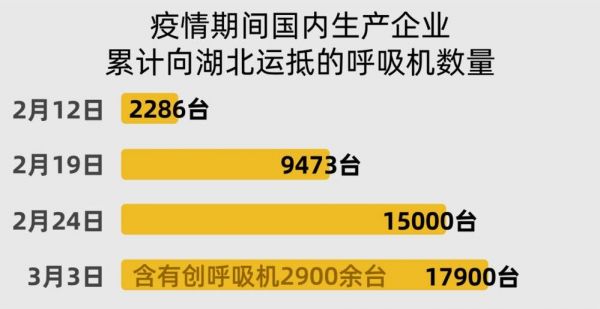 工信部数据显示,全国不断向湖北地区调运呼吸机,在重症、危重症患者总数最多的2月18日,湖北省重症及危重症患者共计11246人,但2月19日时,已有9473台国产呼吸机运抵湖北;而到了2月24日,重症、危重症患者总数为8675人,而当天累计运抵湖北的呼吸机数量则达到15000台。