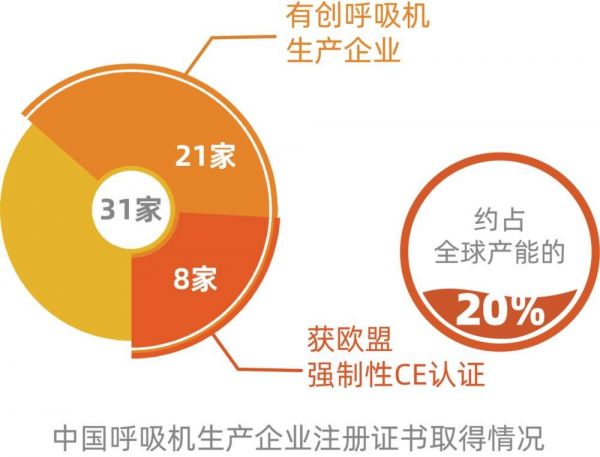 据工信部介绍,我国拥有呼吸机注册证的企业共有31家,其中有创呼吸机生产企业共有21家,8家的主要产品(周产能约2200台)取得了欧盟强制性CE认证,约占全球有创呼吸机产能的五分之一。