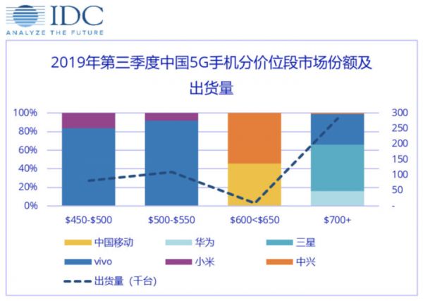 但是,中国手机市场的主力消费段依然还是在 3000-5000 元幅度,从 IDC 去年 11 月公布的第三季度手机分价位段出货量统计看,出货量最高的(5G)手机定价是在 5000 元以内。