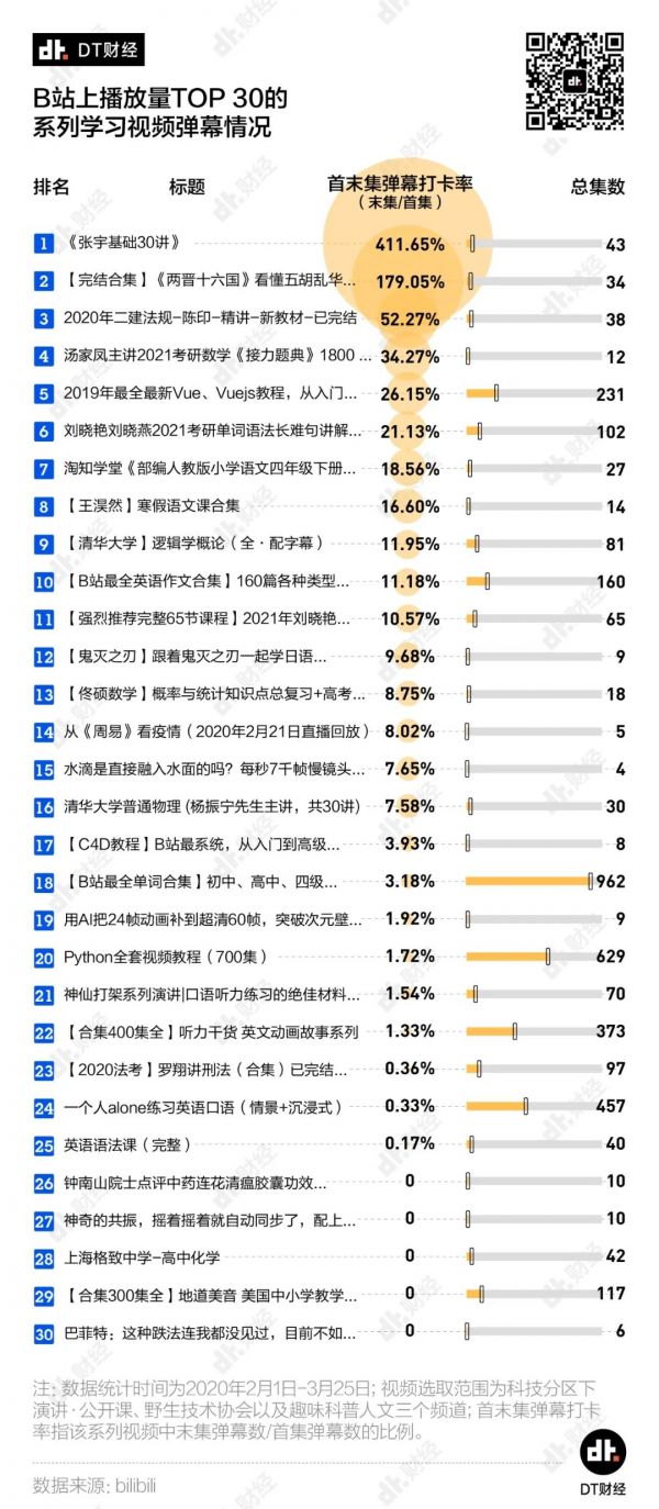 从学习完成度来看,虽然网友们总是在膜拜之下动不动就高喊“你币有了”,但在56000多个视频中,集数超过3集、播放量Top30视频的首末集弹幕打卡率平均不到30%。如果不是《张宇基础30讲》超过400%和《【完结合集】《两晋十六国》看懂五胡乱华的乱世风雨》接近200%打卡率的支撑,剩余28个视频的首末集弹幕打卡率将会降低到9.24%。