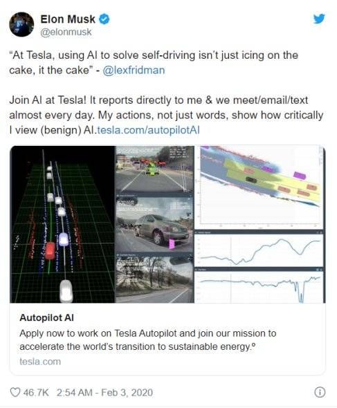 今年 2 月,马斯克亲自为 Autopilot 团队招募人才,正是意在推动对自动驾驶技术的研发。在推特中,马斯克强调 AI(人工智能)在特斯拉自动驾驶战略中具有极为关键的重要性。