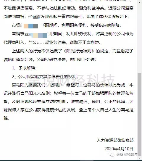 界面新闻向喜马拉雅求证此事,其公关部门人员表示事件属实,同时向界面新闻回应称,“喜马拉雅于2019年8月发布《阳光行为准则》,准则规定:不收受贿赂、不弄虚作假、不侵占公司资产、不泄露保密信息、不参与违法乱纪活动、避免利益冲突。如有员工违反准则,喜马拉雅严格按照准则处理。随着公司的快速发展,喜马拉雅将持续打造诚信、廉政的阳光职场,保障员工在公司获得健康长远的发展。”