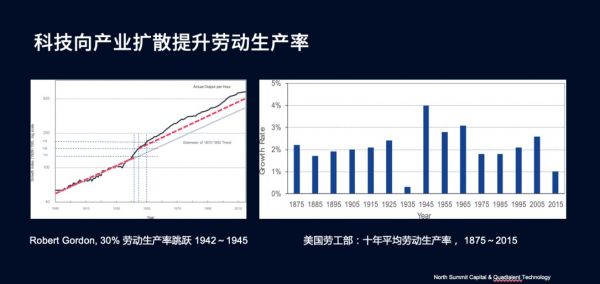 美国劳工部也公布了一个长达100多年的数据,从1875年到2015年,每10年一个档期的劳动生产率提速,能看到在1945年有个非常大的增长,4%左右。