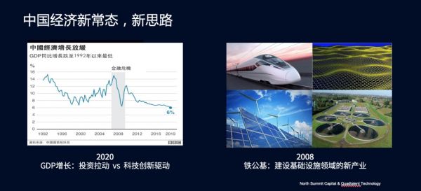 科技的发展是怎样驱动GDP增长的?2008年我们做过一次基建“铁公基”,短期之内拉动了GDP增长,但随后GDP的增速逐渐回调。我们今天的人均GDP产值已经超过了1万美元,进入到中等发达国家的水平,在这样的体量上,用科技创新去拉动经济的长期发展成为一个必然。这种情况下,新基建如何成为经济发展的新动力?要向产业加入智能要素。