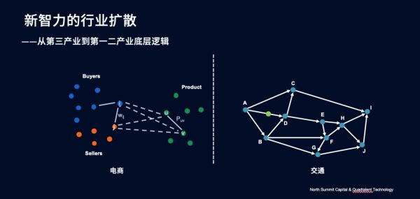 这个例子说明在第三产业和第一、二产业当中,看上去非常不同的场景,底层的逻辑其实是有高度的相似性,尤其是在数学的框架里,有可能抽象出一个统一的逻辑架构,底层的逻辑相通的时候,技术也就自然相通了。