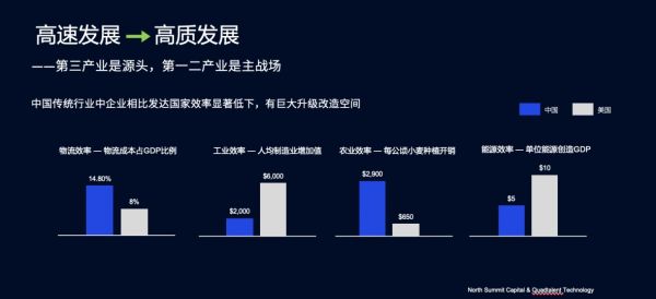根据世界银行的权威数据,比较中美农业和制造业中非常基本的效率指标:在农业当中,每一公顷的小麦,我们的种植成本是2900美元,美国是650美元;在制造业当中,我们人均制造业的增加值是2000美元,美国是6000美元;在制造业当中,我们消耗单位人员所创造的GDP是5美元,美国是10美元。这说明在这些非常成熟的行业当中,我们的效率比发达国家的先进水平还是落后的。在农业、制造业这么大体量的产业当中,试想我们有合适的技术、足够的资金投入、智力资源投入的时候,把它的效率提升到当前发达国家的水平,那所创造出来的价值增量是难以想象。所以,从高速发展往高质量发展的主战场一定是在第一产业和第二产业,而发展的动力源泉来自第三产业——互联网场景下催生的以海量计算能力为核心的新技术。
