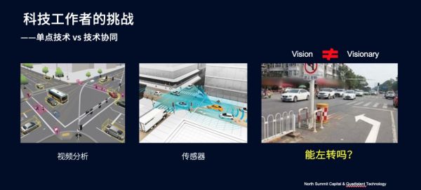 还有一点可能更难,千万不要被自己最擅长的技术蒙住眼睛。用这样一个场景(图十)给大家看一看:在一个十字路口,地面的左转车道旁的柱子上写了禁止左转,远方的信号灯是绿色的。请问如果你是一个无人驾驶程序,有世界上最好的视频识别传感器,你如何决策?该不该左转?最锐利的眼睛在这个时候也会变得迟钝,最好的传感器也会变得六神无主。因为你看到的是明显相互矛盾的两个指示。所以这个场景给了我们一个启示:无人驾驶也好,或者其他行业应用场景也好,不只是靠单点的技术,computer vision不是visionary。
