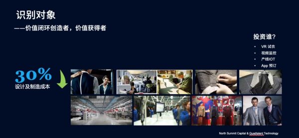 我给大家描述一个很简单的制作西装的场景,量体、裁剪、缝纫、打样、打底,最后再批量化生产。这样一个过程中,有很多的创业企业或所谓的技术工作者发明了很好的技术:有VR虚拟试衣和换衣技术;也有可能用视频监控的技术,看看车间里是否干净;也有可能在产线上放上IoT物联网,看产线的繁忙程度和运行状况;也有人说可以发明一个APP,引来互联网流量,让顾客买咖啡的时候,顺便定一个西装。